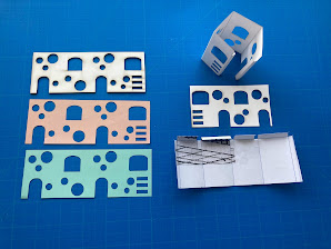 I did both template and material changes for this part of my project. At first I thought I would only use illustration board for the base that would hold the project in place, turns out I used it for the walls of my store as well. And the doors. The original plan was to make the store out of card stock: two pieces glued together with a separation of 5 mm to create some width to the walls. It was way to flimsy, so I made another template for the walls that would now be of illustration board and used the original template of card stock I had to cover those walls.